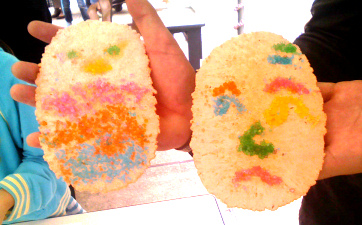 海老煎を一枚もらい、自分で好きに水あめを筆で塗って、うえにカラーの砂糖をまぶすのです。